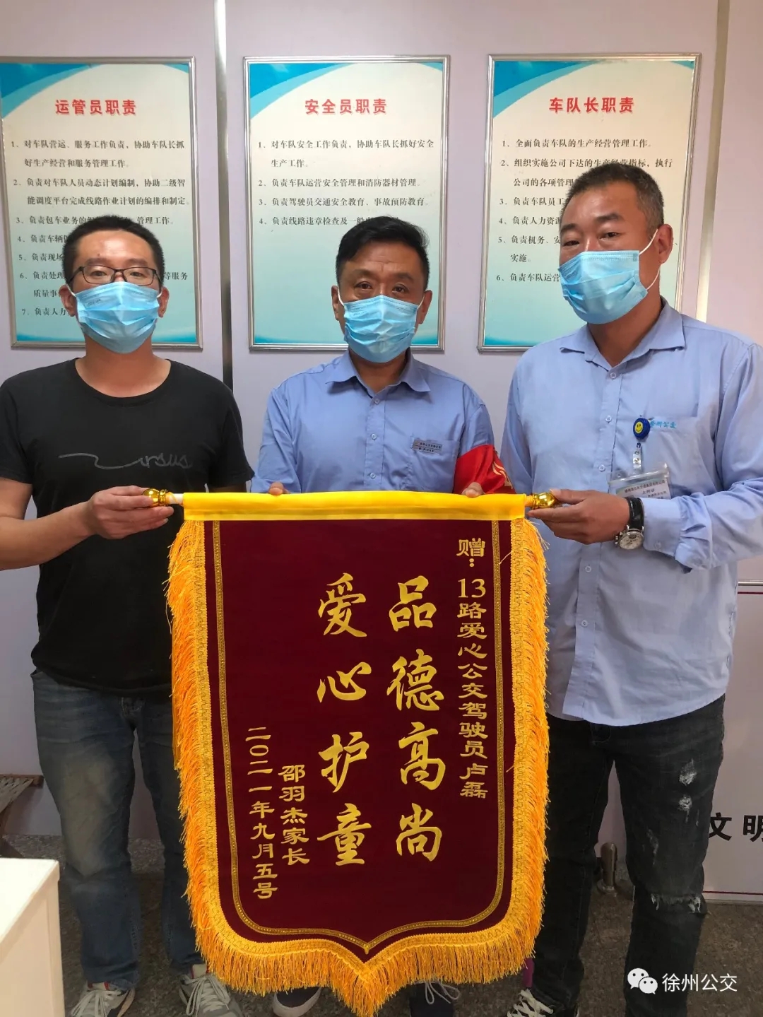 9月8日,市民邵先生來(lái)到京徐巴士公司,送來(lái)了一面印有“品德高尚,愛心護(hù)童”的錦旗,感謝13路駕駛員盧磊的愛心善舉。