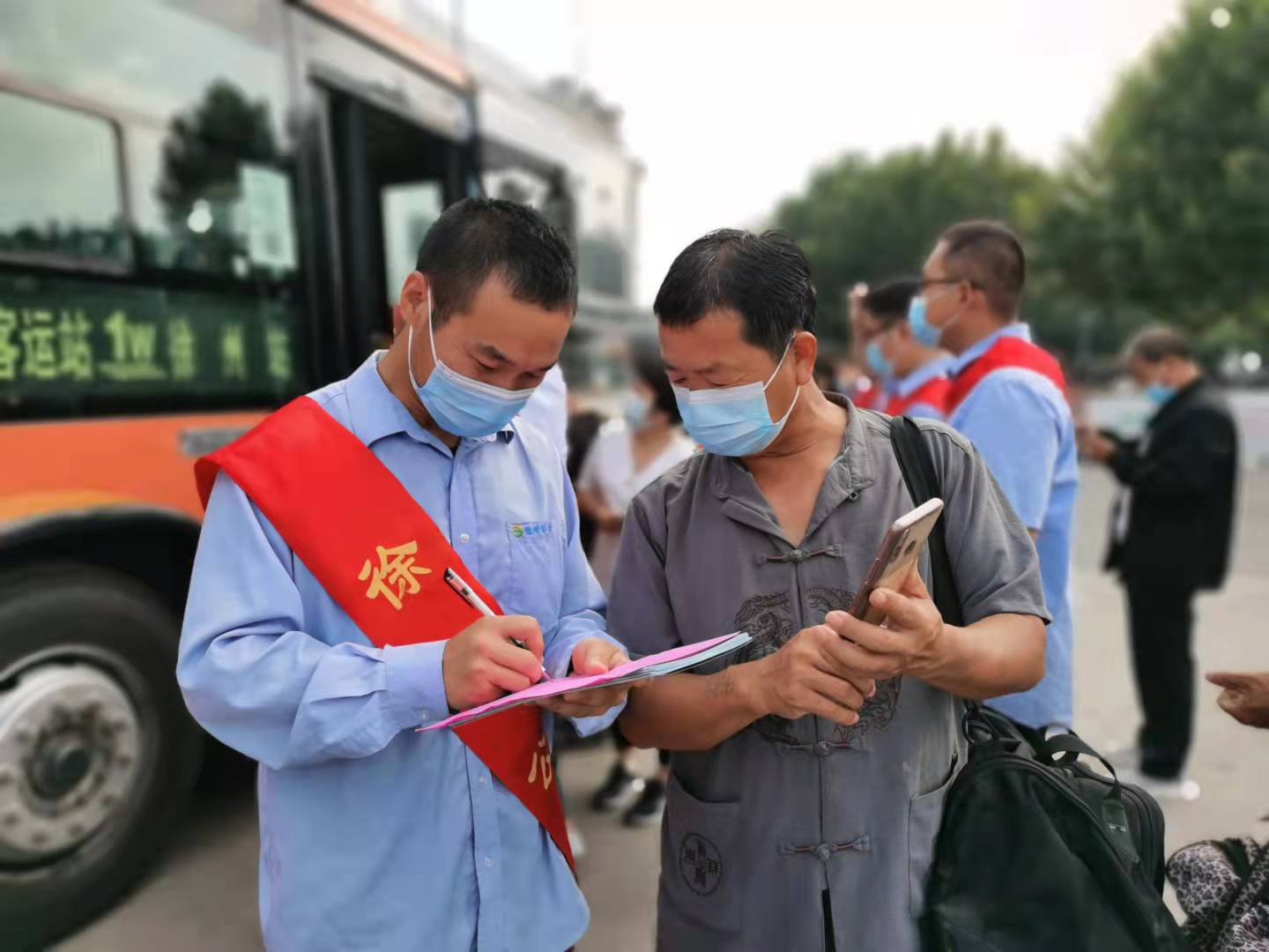 在活動現(xiàn)場,志愿者們積極行動,一邊引導(dǎo)車輛規(guī)范進(jìn)站,一邊疏導(dǎo)乘客有序上下車,解答乘客提問,并幫助乘客調(diào)取“健康碼”及“行程碼”,方便市民乘車。
