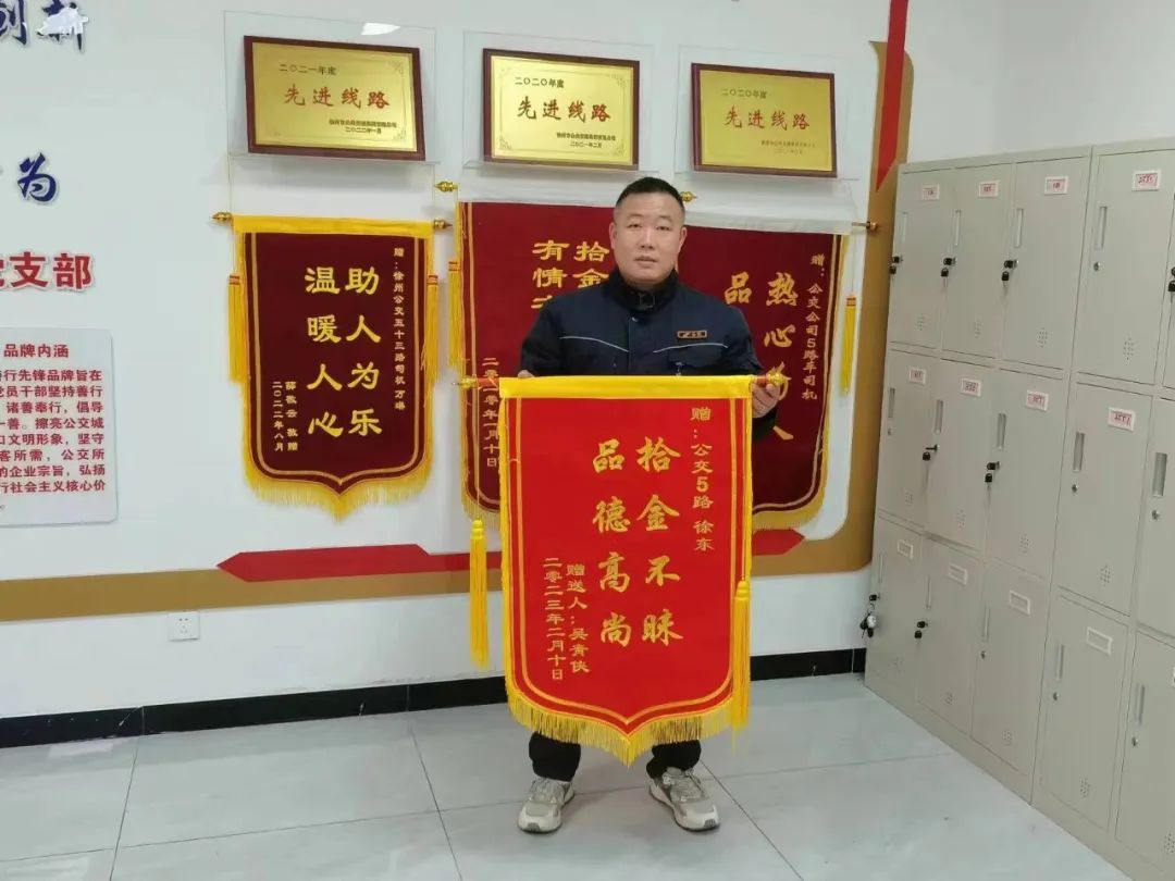 2月12日,王女士帶著印有“拾金不昧 品德高尚”的錦旗再次來到了御景灣調(diào)度室,親手送到了駕駛員徐東的手中以表感謝。