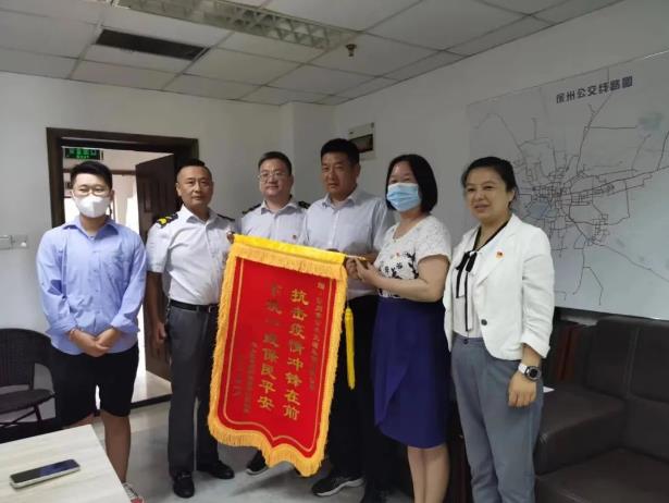 7月28日上午,泉山區(qū)段莊街道紡西社區(qū)書記余蘭,副主任王艷宇把一面印有“抗擊疫情沖鋒在前,下沉一線保民平安”的錦旗送到公交集團(tuán)。