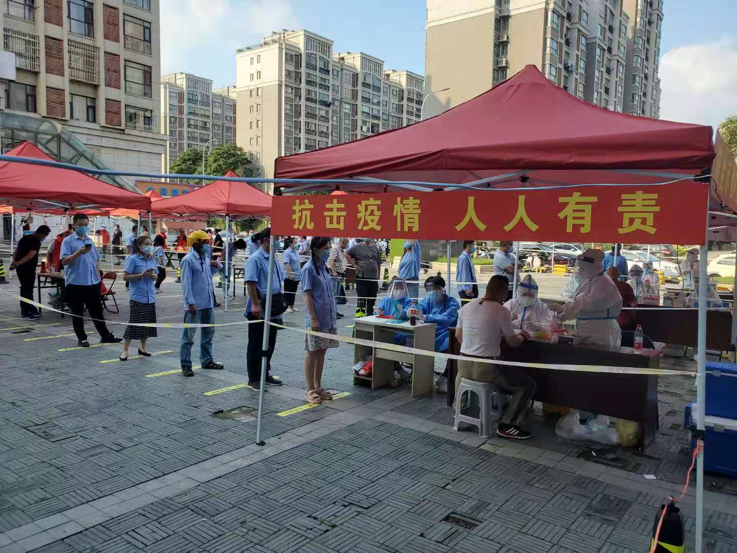 在銅山新區(qū)樵村社區(qū)檢測點,新區(qū)公司指定專人現(xiàn)場維護秩序、登記信息、疏導(dǎo)人員,全方位抓緊、抓實、抓細每個環(huán)節(jié)。“請大家佩戴好口罩,保持間距。”“請大家排好隊,提前拿出身份證,打開行程碼和健康碼……”檢測現(xiàn)場,工作人員不斷引導(dǎo)員工做好檢測前的準備工作。