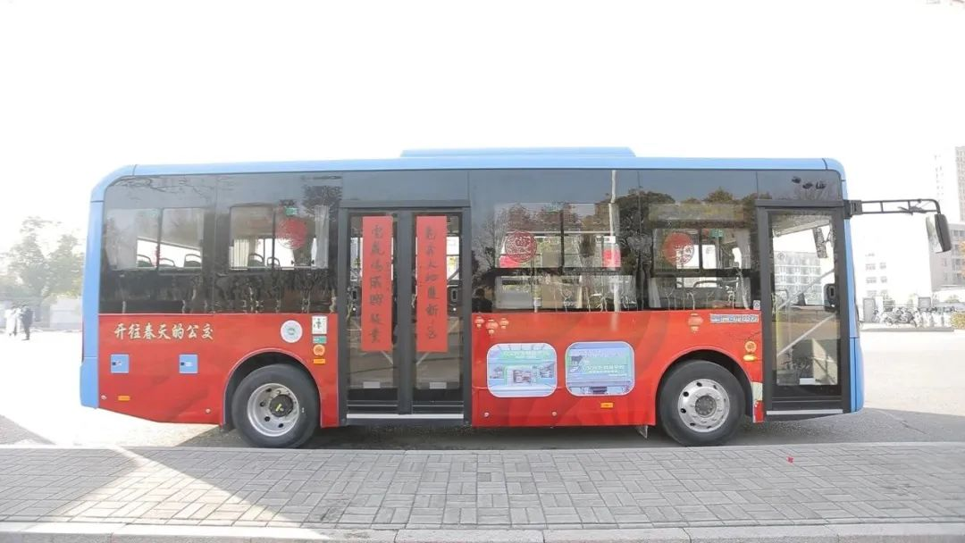 除了車身內外的暖心標語,公交車廂里布置得“年味兒”十足:車窗、車門張貼了徐州市青年書法家協(xié)會、徐州市青年藝術家協(xié)會提供的“福”字、春聯(lián)等書法作品;車內把手貼著徐州公交企業(yè)文化;燈箱內是乘客轉乘線路、新辟線路以及公交“一主四輔”便民惠民措施的情況介紹;車內還裝飾了精美的中國結、火紅的圓燈籠、喜慶的窗花……將嶄新的公交車廂裝扮得十分溫馨。