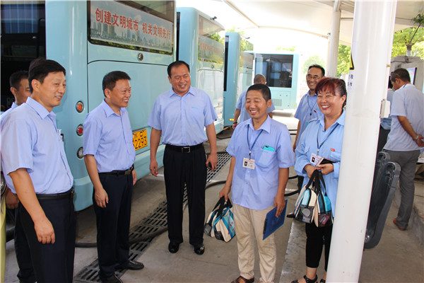 炎炎烈日下,空調(diào)公交車(chē)成為市民出行首選。為給市民營(yíng)造舒適、涼爽的乘車(chē)環(huán)境,各運(yùn)營(yíng)公司應(yīng)用公交GPS智能調(diào)度系統(tǒng),科學(xué)調(diào)度、靈活排班、保證運(yùn)力充足。同時(shí),結(jié)合創(chuàng)建工作,提高服務(wù)質(zhì)量,全市2100多輛空調(diào)車(chē)全部開(kāi)足冷氣;駕乘人員揮汗如雨堅(jiān)持“一趟一清掃”,認(rèn)真做好車(chē)輛清潔工作;督導(dǎo)隊(duì)員冒著高溫在各大站臺(tái)維持秩序、扶老攜幼、做好導(dǎo)乘服務(wù)、嚴(yán)查易燃易爆及危險(xiǎn)品。由于各項(xiàng)舉措落實(shí)到位,確保了高溫期間全市161條公交線路運(yùn)營(yíng)順暢,乘客走好走了。(圖為董事長(zhǎng)、總經(jīng)理杜紅軍,總經(jīng)理助理李修超一行在食品城充電站慰問(wèn)堅(jiān)守崗位的充電員工。)