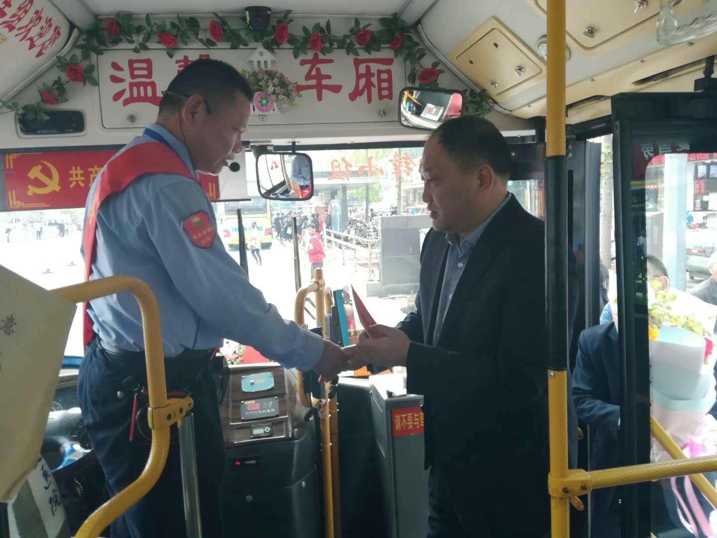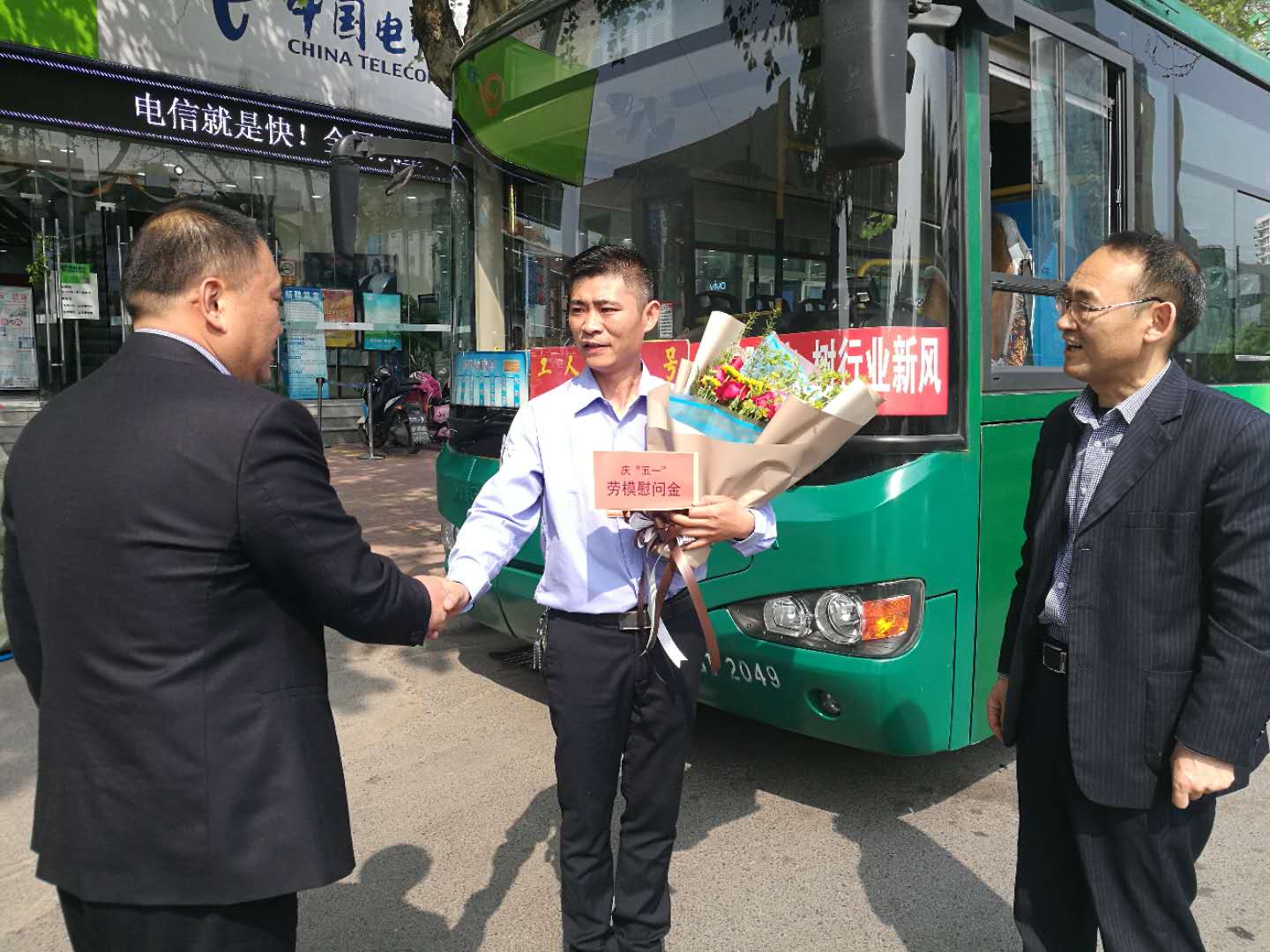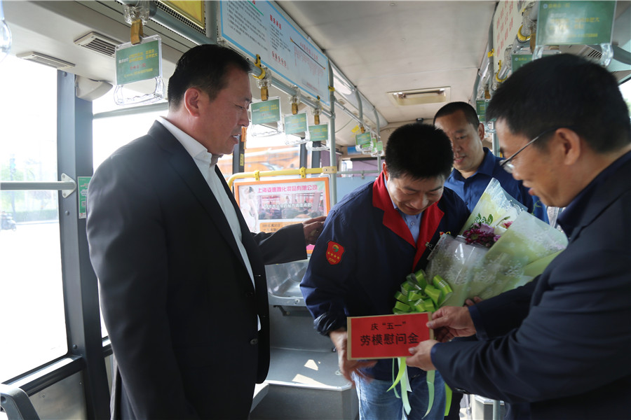 杜紅軍一行首先來到韓山終點站,剛行駛完一趟的市勞模、49路線駕駛員王博正利用休停時間打掃車輛,杜總走上前親切地與王博握手,并把一束嬌艷芬芳的鮮花和勞模慰問金送到他手中。