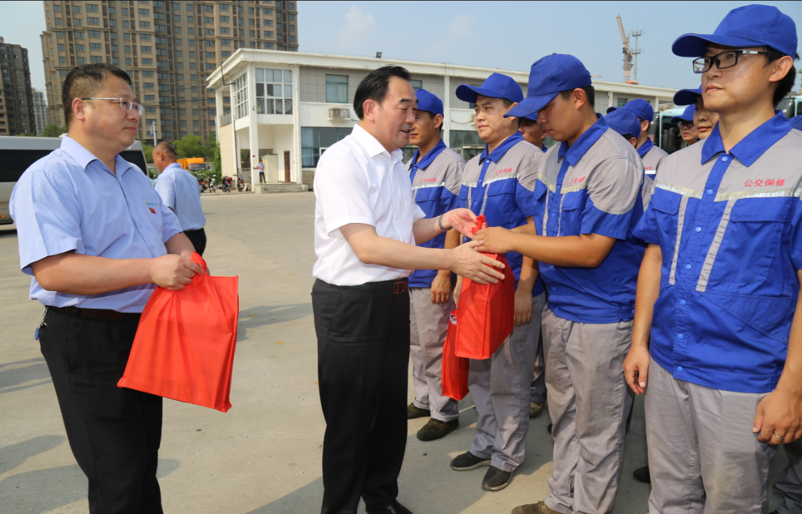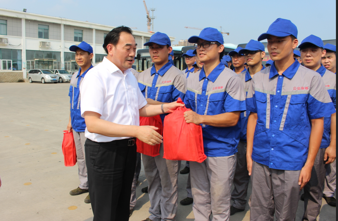 在烈日下的公交郭莊停車場(chǎng),周鐵根書記看到堅(jiān)守崗位的公交員工們汗流浹背,親切地上前與公交駕駛員、修理人員等一線員工一一握手。“大家辛苦了!感謝你們!”他對(duì)廣大公交員工為保障全市人民高溫天氣正常出行所付出的辛勤勞動(dòng)表示充分肯定,又將洗發(fā)水、毛巾、肥皂等降暑物品,以及《安全生產(chǎn)知識(shí)職工普及讀本》等書一一送到公交員工手中,叮囑有關(guān)負(fù)責(zé)人,要多愛護(hù)、關(guān)心一線職工,切實(shí)做好防暑降溫措施,為公交員工創(chuàng)造好的工作條件,切實(shí)維護(hù)廣大職工的安康權(quán)益,確保高溫天里職工的身體健康和安全生產(chǎn),讓職工安全度夏、清涼度夏,真正感受到黨和政府的關(guān)懷、工會(huì)組織的關(guān)心和社會(huì)各界的關(guān)愛。他還關(guān)心地叮囑公交員工們要?jiǎng)谝萁Y(jié)合,做好高溫防護(hù),保重身體,杜絕疲勞駕駛,確保安全行車,并希望大家更好地堅(jiān)守崗位、服務(wù)群眾,為保障市民安全有序的出行環(huán)境,打造我市優(yōu)化營(yíng)商環(huán)境、營(yíng)造文明城市良好氛圍做出更大的貢獻(xiàn)。