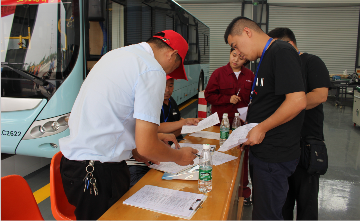比賽開始了!參賽選手們穿戴整齊的工作服,個(gè)個(gè)卯足了勁,整裝待發(fā)。整潔的維修車間兩個(gè)工作臺上,四組修理人員同時(shí)進(jìn)行盤式制動器拆裝組合的項(xiàng)目比賽,四名裁判員認(rèn)真對照標(biāo)準(zhǔn)計(jì)分,現(xiàn)場安靜得只聽見制動器拆裝時(shí)輕微的“啪啪”聲。一旁的4個(gè)檢修地溝上,分別停著4輛新能源純電動公交車,同時(shí)進(jìn)行著新能源車電控故障排除項(xiàng)目的比賽。參賽人員時(shí)而在駕駛室時(shí)而在車廂尾部檢修電路,裁判員根據(jù)實(shí)際操作隨機(jī)提問、記錄。