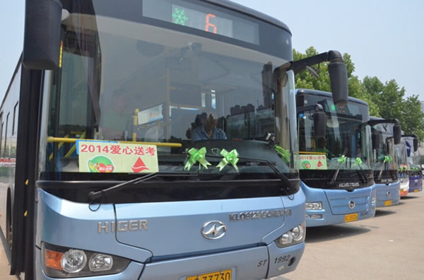 一年一度的高考是社會關注的熱點,每年這個時候,徐州的大街小巷都有這樣一個群體——送考愛心車隊。懸掛綠絲帶的送考車,成為城市道路上靚麗的風景。今年,公司也加入到“愛心送考,算我一個”2014愛心送考公益活動中,在66路、76路、65路、11路、608路等5條途經(jīng)考點的線路成立“愛心公交”送考專線。高考期間,考生憑準考證可免費乘坐這5條線路。為了給考生提供力所能及的幫助,駕駛員還在車上配備了方便袋、清涼油、創(chuàng)可貼等用品,以備乘客不時之需。圖為“愛心送考”啟動儀式現(xiàn)場。